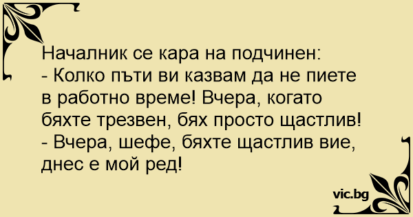 - Колко пъти ви казвам да не пиете в работно време! Вчера, когато бяхте трезвен, бях просто щастлив!