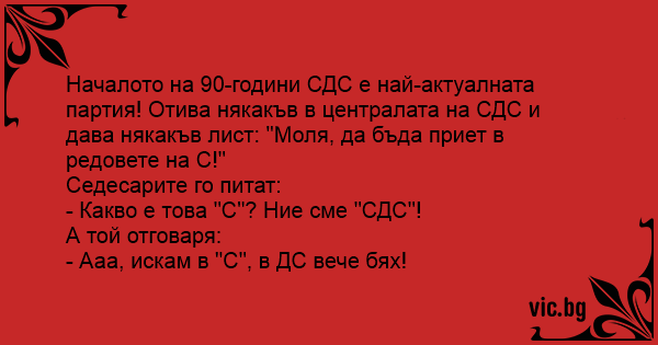 Началото на 90-години СДС е най-актуалната партия! Отива някакъв в централата на СДС и дава някакъв лист: "Моля, да бъда приет в редовете на С!"