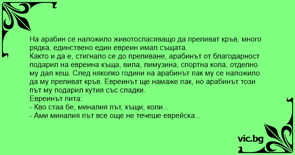 Както и да е, стигнало се до преливане, арабинът от благодарност подарил на евреина къща, вила, лимузина, спортна кола, отделно му дал кеш. След няколко години на арабинът пак му се наложило да му преливат кръв. Евреинът ще намаже пак, но арабинът този път му подарил кутия със сладки.