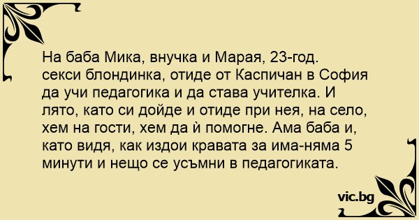 секси блондинка, отиде от Каспичан в София да учи педагогика и да става учителка. И лято, като си дойде и отиде при нея, на село, хем на гости, хем да ѝ помогне. Ама баба и, като видя, как издои кравата за има-няма 5 минути и нещо се усъмни в педагогиката.