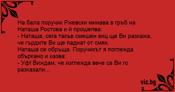 - Наташа, сега такъв смешен виц ще Ви разкажа, че гърдите Ви ще паднат от смях.