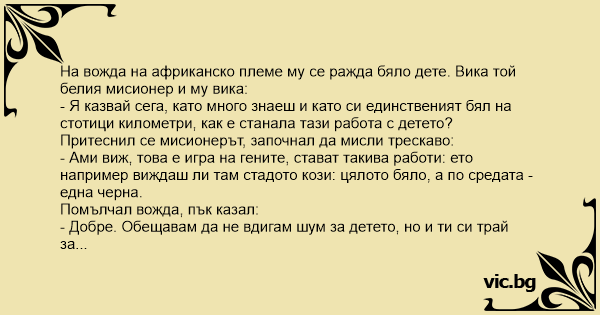 На вожда на африканско племе му се ражда бяло дете. Вика той белия мисионер и му вика: