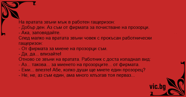 - Добър ден. Аз съм от фирмата за почистване на прозорци.
