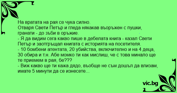 - Я да видим сега какво пише в дебелата книга - казал Свети Петър и заотгръщал книгата с историята на посетителя.