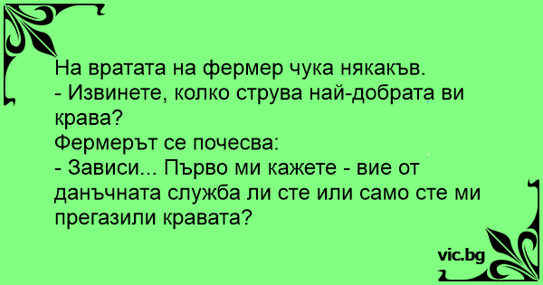 - Зависи... Първо ми кажете - вие от данъчната служба ли сте или само сте ми прегазили кравата?