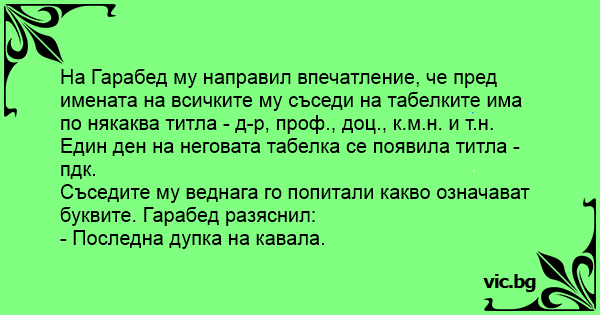 На Гарабед му направил впечатление, че пред имената на всичките му съседи на табелките има по някаква титла - д-р, проф., доц., к.м.н. и т.н.