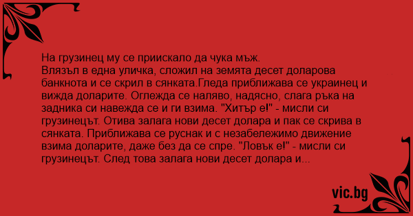 Влязъл в една уличка, сложил на земята десет доларова банкнота и се скрил в сянката.Гледа приближава се украинец и вижда доларите. Оглежда се наляво, надясно, слага ръка на задника си навежда се и ги взима. "Хитър е!" - мисли си грузинецът. Отива залага нови десет долара и пак се скрива в сянката. Приближава се руснак и с незабележимо движение взима доларите, даже без да се спре. "Ловък е!" - мисли си грузинецът. След това залага нови десет долара и пак се скрива. Приближава се друг грузинец. Погледнал доларите, ритнал ги нанякъде и отминал без да ги вземе. "Горд е!" - помислил си грузинецът. Отишъл да си вземе доларите, навел се... "И КОВАААРЕН!!!"