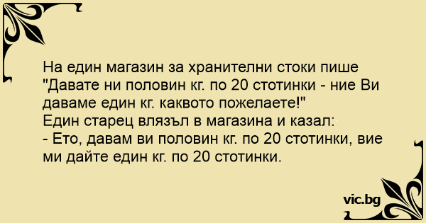 На един магазин за хранителни стоки пише "Давате ни половин кг. по 20 стотинки - ние Ви даваме един кг. каквото пожелаете!"