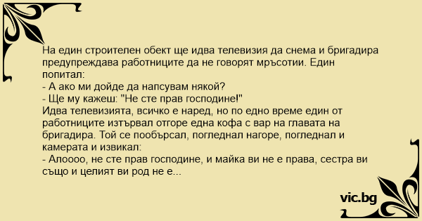 На един строителен обект ще идва телевизия да снема и бригадира предупреждава работниците да не говорят мръсотии. Един попитал: