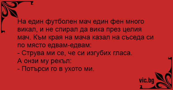 На един футболен мач един фен много викал, и не спирал да вика през целия мач. Към края на мача казал на съседа си по място едвам-едвам: