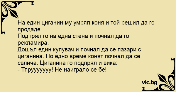 На един циганин му умрял коня и той решил да го продаде.