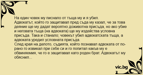 - А бе, защо не ми каза по-рано. Да беше убил и моята тъща, пък щяхме да си го оправдаеме човека.