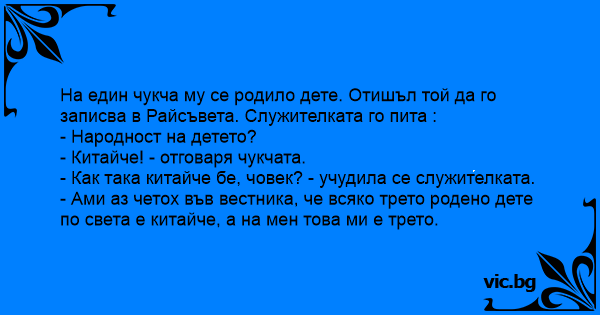 - Ами аз четох във вестника, че всяко трето родено дете по света е китайче, а на мен това ми е трето.