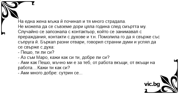 Не можела да се съвземе дори цяла година след смъртта му. Случайно се запознала с контактьор, който се занимавал с прераждания, контакти с духове и т.н. Помолила го да я свърже със съпруга й. Бъркал разни отвари, говорил странни думи и успял да се свърже с духа: