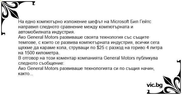 На едно компютърно изложение шефът на Microsoft Бил Гейтс направил следното сравнение между компютърната и автомобилната индустрия.