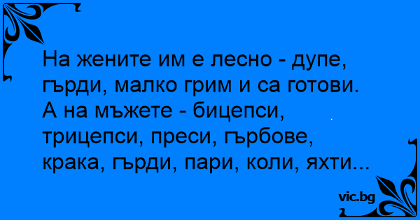 А на мъжете - бицепси, трицепси, преси, гърбове, крака, гърди, пари, коли, яхти...