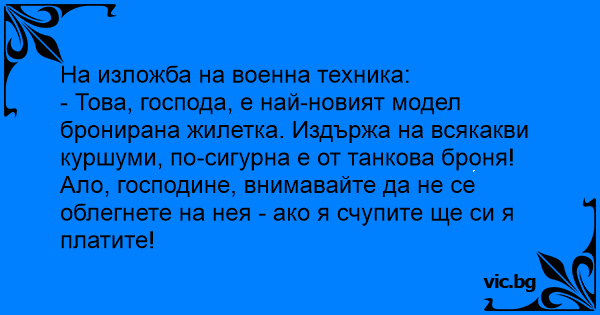 - Това, господа, е най-новият модел бронирана жилетка. Издържа на всякакви куршуми, по-сигурна е от танкова броня! Ало, господине, внимавайте да не се облегнете на нея - ако я счупите ще си я платите!