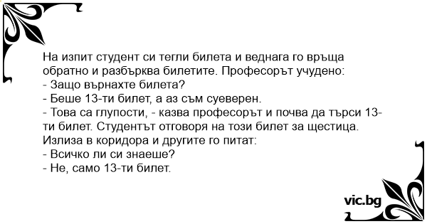 - Това са глупости, - казва професорът и почва да търси 13-ти билет. Студентът отговоря на този билет за щестица.