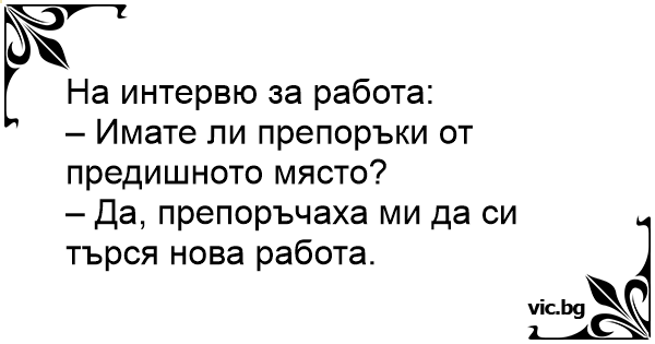 - Har du noen anbefaling fra din tidligere arbeidsgiver? - Ja, han anbefalte meg å søke på ny jobb!