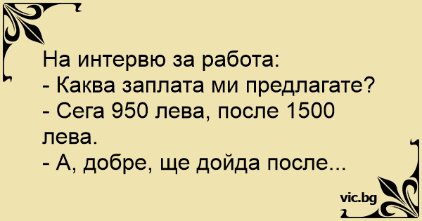 Blonde's Starting Salary Un tipo en una entrevista de trabajo Gehalt des Nachwuchsspielers At an interview: O rapaz chega para a entrevista de emprego. O contratante vai logo dizendo: - É o seguinte, de início o salário é de 700 reais. - Ah, não sei não. Esse salário está muito baixo - diz o rapaz. - Mas em 3 meses o salário é aumentado para 3 mil reais - explica o contratante. E o rapaz diz: - Aí sim,... Ein Mann beim Vorstellungsgespräch. Mann: "Wieviel verdiene ich da denn so?" Chef: "Oh,so ungefähr 500 € im Monat!" Mann: "Das ist aber wenig." Chef: "Das wird aber später mehr!" Mann: "Och, dann... - Ile będę zarabiał? - pyta młody człowiek podejmujący pierwszą w życiu pracę. - Na początek dostanie pan 600 zł, ale później będzie pan mógł zarobić dużo więcej. - Doskonale - ucieszył się... Un hombre llega a buscar trabajo y llega a una empresa y pregunta cuanto le van a pagar si trabaja allí. El empresario le responde: - Al principio vas a cobrar 800 dólares al mes y mas tarde 1000... - Du har fått jobben og kan begynne på mandag. Lønnen blir 6000 de to første månedene og etter to måneder stiger den til 8000.- - Takk, da starter jeg om to måneder. Va un trabajador a buscar empleo y le dicen: - Si empieza hoy le pagaremos 80.000 pesetas, pero más adelante usted cobrará 200.000 pesetas. Y el trabajador le contesta: - Pues vengo más adelante. Adam iş başvurusu için gider. İş yerinde iş yeri sahibine sorar; - Aylık kaç lira veriyorsunuz? İş yeri sahibi cevap olarak; - Şimdilik 3000 bir ay sonra 5000 Adamın cevap olarak; - İyi o zaman ben... Im Job-Interview: "Am Anfang können Sie 2.500 Euro im Monat verdienen. Und später können es auch 5000 Euro werden." "Ok, dann komme ich später."