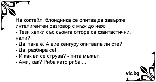На коктейл, блондинка се опитва да завърже интелигентен разговор с мъж до нея: