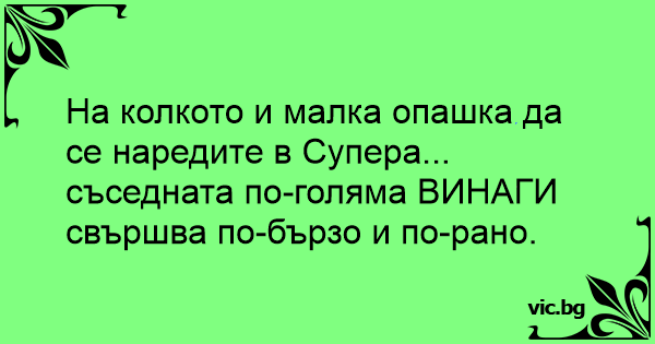На колкото и малка опашка да се наредите в Супера... съседната по-голяма ВИНАГИ свършва по-бързо и по-рано.