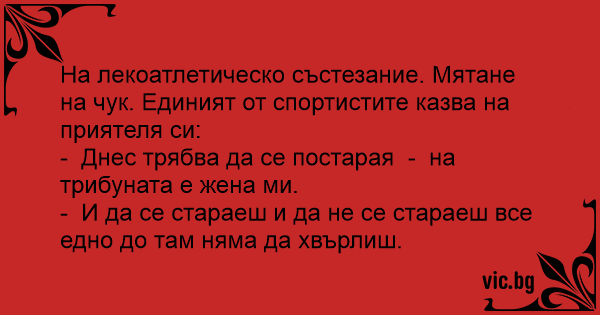 На лекоатлетическо състезание. Мятане на чук. Единият от спортистите казва на приятеля си: