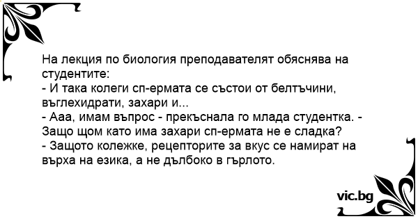 - Ааа, имам въпрос - прекъснала го млада студентка. - Защо щом като има захари cпepmata не е сладка?