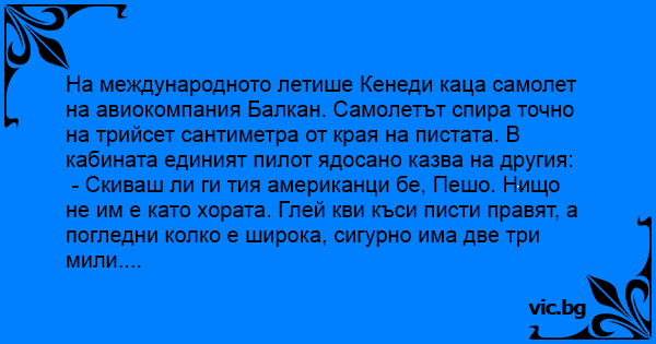 - Скиваш ли ги тия американци бе, Пешо. Нищо не им е като хората. Глей кви къси писти правят, а погледни колко е широка, сигурно има две три мили....