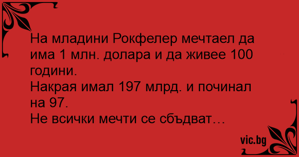 На младини Рокфелер мечтаел да има 1 млн. долара и да живее 100 години.