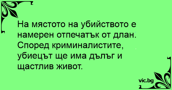 На мястото на убийството е намерен отпечатък от длан. Според криминалистите, убиецът ще има дълъг и щастлив живот.