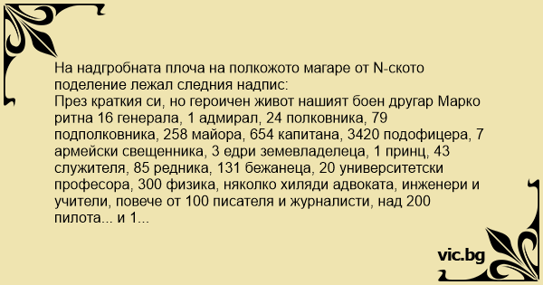 През краткия си, но героичен живот нашият боен другар Марко ритна 16 генерала, 1 адмирал, 24 полковника, 79 подполковника, 258 майора, 654 капитана, 3420 подофицера, 7 армейски свещенника, 3 едри земевладелеца, 1 принц, 43 служителя, 85 редника, 131 бежанеца, 20 университетски професора, 300 физика, няколко хиляди адвоката, инженери и учители, повече от 100 писателя и журналисти, над 200 пилота... и 1 противопехотна мина!