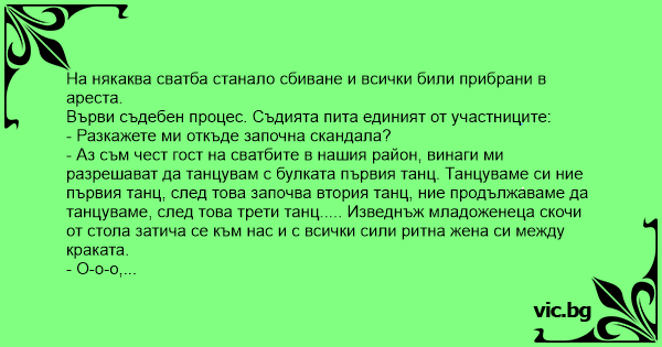 - Аз съм чест гост на сватбите в нашия район, винаги ми разрешават да танцувам с булката първия танц. Танцуваме си ние първия танц, след това започва втория танц, ние продължаваме да танцуваме, след това трети танц..... Изведнъж младоженеца скочи от стола затича се към нас и с всички сили ритна жена си между краката.