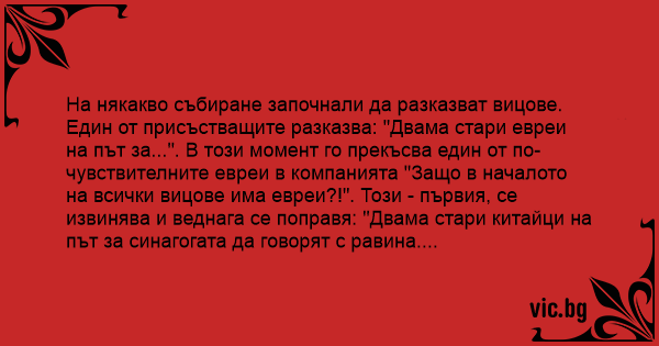 Един от присъстващите разказва: "Двама стари евреи на път за...". В този момент го прекъсва един от по-чувствителните евреи в компанията "Защо в началото на всички вицове има евреи?!". Този - първия, се извинява и веднага се поправя: "Двама стари китайци на път за синагогата да говорят с равина....