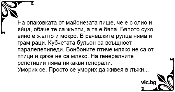 На опаковката от майонезата пише, че е с олио и яйца, обаче те са жълти, а тя е бяла. Бялото сухо вино е жълто и мокро. В рачешките рулца няма и грам раци. Кубчетата бульон са всъщност паралелепипеди. Бонбоните птиче мляко не са от птици и даже не са мляко. На генералните репетиции няма никакви генерали.