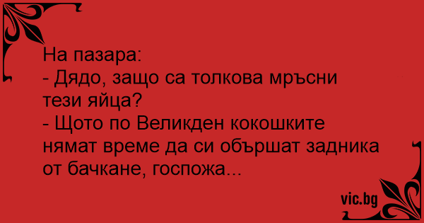 - Щото по Великден кокошките нямат време да си обършат задника от бачкане, госпожа...