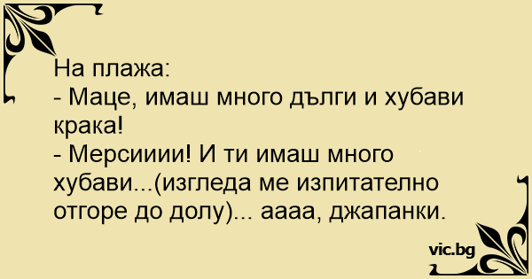На плажа:<br />- Маце, имаш много дълги и хубави крака!<br />- Мерсииии! И ти имаш много хубави...(изгледа ме изпитателно отгоре до долу)... аааа, джапанки.