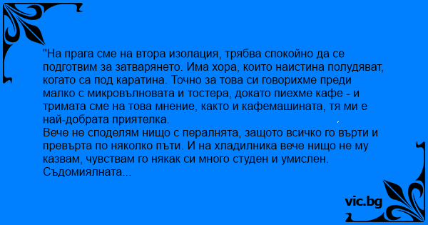 "На прага сме на втора изолация, трябва спокойно да се подготвим за затварянето. Има хора, които наистина полудяват, когато са под каратина. Точно за това си говорихме преди малко с микровълновата и тостера, докато пиехме кафе - и тримата сме на това мнение, както и кафемашината, тя ми е най-добрата приятелка.