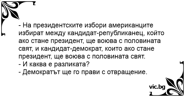 - На президентските избори американците избират между кандидат-републиканец, който ако стане президент, ще воюва с половината свят, и кандидат-демократ, които ако стане президент, ще воюва с половината свят.
