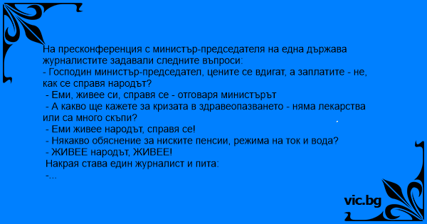 На пресконференция с министър-председателя на една държава журналистите задавали следните въпроси: