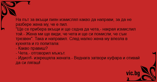 "Ще се прибера вкъщи и ще седна да чета,- накрая измислил той.- Жена ми ще види, че чета и ще си помисли, че съм трезвен". Така и направил. След малко жена му влезла в кухнята и го попитала:
