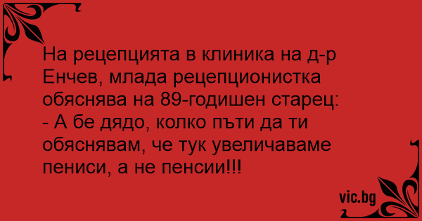 На рецепцията в клиника на д-р Енчев, млада рецепционистка обяснява на 89-годишен старец: