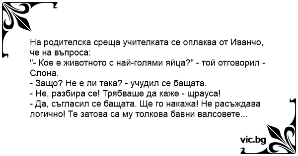 На родителска среща учителката се оплаква от Иванчо, че на въпроса: