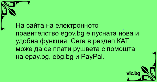 На сайта на електронното правителство egov.bg е пусната нова и удобна функция. Сега в раздел КАТ може да се плати рушвета с помощта на epay.bg, ebg.bg и PayPal.