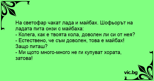 На светофар чакат лада и майбах. Шофьорът на ладата пита онзи с майбаха: