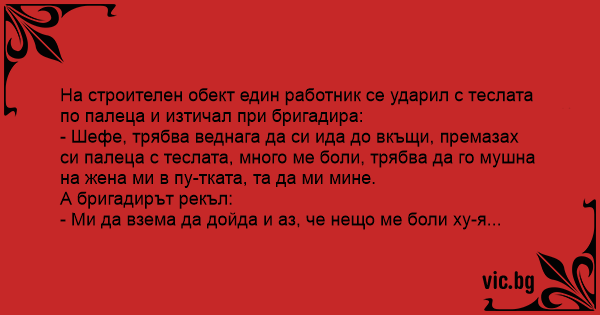 - Шефе, трябва веднага да си ида до вкъщи, премазах си палеца с теслата, много ме боли, трябва да го мушна на жена ми в пуtkata, та да ми мине.
