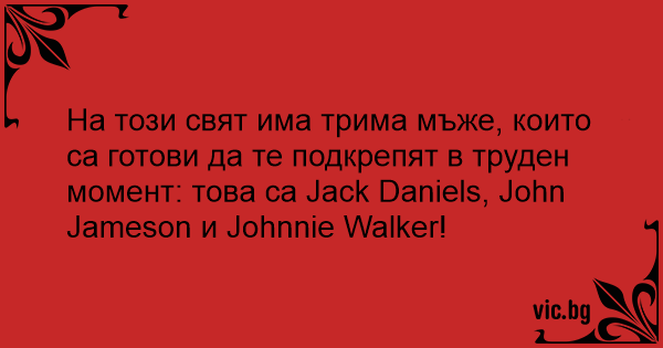 На този свят има трима мъже, които са готови да те подкрепят в труден момент: това са Jack Daniels, John Jameson и Johnnie Walker!