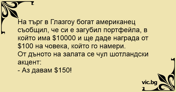 На търг в Глазгоу богат американец съобщил, че си е загубил портфейла, в който има $10000 и ще даде награда от $100 на човека, който го намери.