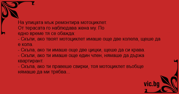- Скъпа, ако ти правеше cbиpkи, тоя мотоциклет въобще нямаше да ми трябва...