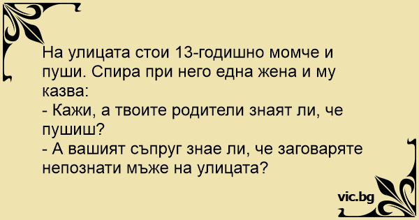 На улицата стои 13-годишно момче и пуши. Спира при него една жена и му казва: